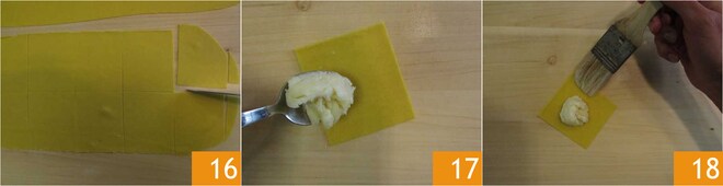 Schneiden Sie daraus Quadrate von 6x6 cm 16, füllen Sie jedes Quadrat mit einem halben Teelöffel Grana Padano DOP Riserva Füllung 17. Befeuchten Sie die Ränder leicht mit Wasser 18.