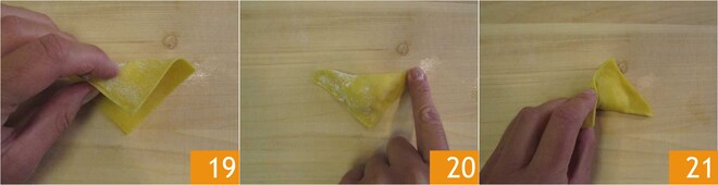 Falten Sie sie zuerst zu einem Dreieck 19, drücken Sie die Ränder gut, um sie zu versiegeln 20, dann falten Sie die beiden Enden zur Mitte 21.