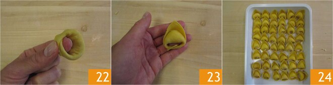 Schließen Sie die Cappellacci, indem Sie die beiden Enden verbinden 22, gut zusammendrücken. Fahren Sie so mit allen anderen fort 23 24.