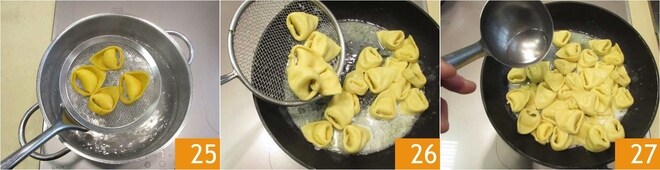 Jetzt, da sie fertig sind, kochen und würzen: Bringen Sie reichlich Wasser in einem großen Topf zum Kochen und salzen Sie es, wenn es kocht. Erhitzen Sie in einer großen Pfanne sanft die Butter und fügen Sie eine Kelle Kochwasser hinzu. Kochen Sie Ihre Cappellacci in kochendem Salzwasser etwa 3 Minuten lang 25. Dann direkt in der Pfanne mit der Butter abtropfen lassen 26 und bei Bedarf eine weitere Kelle Wasser hinzufügen 27.