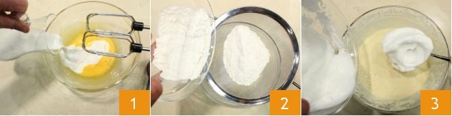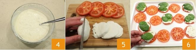 Um die gebratene Caprese zuzubereiten, beginnen Sie mit dem Teig: Trennen Sie das Eiweiß vom Eigelb, schlagen Sie letzteres mit einer Prise Salz mit einem elektrischen Schneebesen, gießen Sie die Milch 1 unter ständigem Rühren ein und fügen Sie dann nach und nach das gesiebte Mehl 2 hinzu, während Sie weiter rühren, um eine glatte Masse zu erhalten. Schlagen Sie separat das Eiweiß steif und heben Sie es dann vorsichtig mit einem Spatel unter die Masse, um es nicht zu entlüften 3.