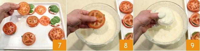 Decken Sie es dann mit einer weiteren Tomatenscheibe ab, um eine Art Sandwich zu erstellen 7. Erhitzen Sie in einem Topf mit hohem Rand das Pflanzenöl zum Frittieren, für optimales Garen sollte das Öl eine Temperatur von etwa 170° haben. Nehmen Sie nun jede Caprese, tauchen Sie sie zuerst in den Teig, um sie vollständig zu bedecken (8-9).