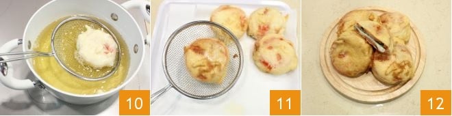 und dann, mit Hilfe eines Schaumlöffels, tauchen Sie sie in das Öl, um sie zu frittieren. Wenn der Teig goldbraun und knusprig ist, heben Sie die Caprese mit einem Schaumlöffel heraus 10 und lassen Sie sie auf einem mit Küchenpapier ausgelegten Tablett abtropfen, um überschüssiges Öl zu entfernen 11. Genießen Sie die gebratene Caprese gut heiß 12!