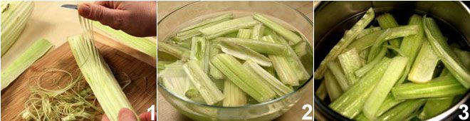 Beginnen Sie die Zubereitung der geschmorten Kardone, indem Sie das Gemüse auf diese Weise reinigen: Schneiden Sie den unteren Teil des Kardonbündels ab und trennen Sie jede Rippe, indem Sie die Blätter entfernen. Wenn die Kardonrippen zu breit sind, schneiden Sie sie der Länge nach in zwei Hälften und ritzen Sie dann mit einem Messer ein Ende ein und ziehen Sie in die entgegengesetzte Richtung 1, um die Fäden zu entfernen. Wiederholen Sie den Vorgang vom anderen Ende aus. Sobald alle Fäden entfernt sind, schneiden Sie den Kardon in etwa 15 cm lange Stücke, die Sie in eine Schüssel mit angesäuertem Wasser 2 (d. h. mit dem Saft einer Zitrone) legen, damit sie nicht dunkel werden. Nachdem Sie alle Kardone gereinigt und geschnitten haben, spülen Sie sie unter fließendem kaltem Wasser ab und blanchieren Sie sie 3, indem Sie sie in einen Topf mit reichlich Wasser und einem Esslöffel grobem Salz geben, etwa 15 Minuten, wenn Sie einen Schnellkochtopf verwenden, oder etwa 25-30 Minuten, wenn Sie sie traditionell garen.