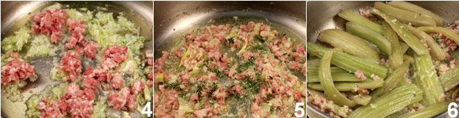 Sobald sie gekocht sind, lassen Sie die Kardone abtropfen. In einem separaten Topf geben Sie das Öl und die Frühlingszwiebeln, die Sie bei schwacher Hitze etwa 15 Minuten lang anbraten lassen; fügen Sie den gehackten Speck 4, den Thymian und den Zimt 5 hinzu und lassen Sie alles für einige Minuten anbraten, dann fügen Sie die Kardone hinzu 6, mischen Sie vorsichtig und geben Sie den Weißwein dazu, den Sie verdampfen lassen.