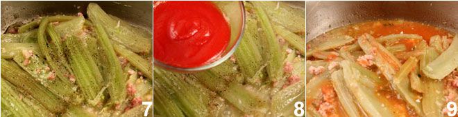 Mit Salz und Pfeffer abschmecken 7, die Tomatenpassata hinzufügen 8 und gegebenenfalls eine Kelle heißes Wasser, dann weiterkochen lassen, bis alle Zutaten gut durchgezogen sind 9 und die Kochflüssigkeit sich reduziert hat. Fügen Sie den geriebenen Parmesan hinzu und servieren Sie die geschmorten Kardone noch heiß.