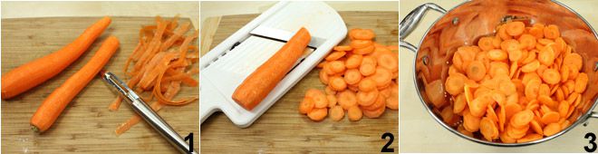 Um die Karotten in Milch zuzubereiten, waschen und schälen Sie die Karotten 1, schneiden Sie sie dann in Scheiben 2 mit einer Dicke von etwa 3 mm 3.
