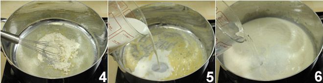Schmelzen Sie 30 g Butter in einem breiten und flachen Topf, fügen Sie dann das Mehl hinzu 4, rühren Sie um und geben Sie anschließend die Milch 5 und das Wasser 6 hinzu,