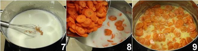 den Muskat und das Salz 7: rühren Sie gut mit einem Schneebesen, um die Bildung von Klumpen zu vermeiden, und sobald die Flüssigkeit im Topf zu kochen beginnt, fügen Sie die geschnittenen Karotten hinzu 8. Lassen Sie die Karotten in Milch sanft kochen, bis sie zart, aber nicht zerkocht sind und die Kochflüssigkeit eingedickt und ziemlich eingekocht ist 9. Kurz vor dem Ende der Garzeit eventuell mit Salz abschmecken und dann die heißen und cremigen Karotten in Milch servieren. Wenn Sie möchten, können Sie sie mit gehackter Petersilie bestreuen, oder (wenn Sie sie nicht für Kinder servieren) mit weißem Pfeffer bestäuben.
