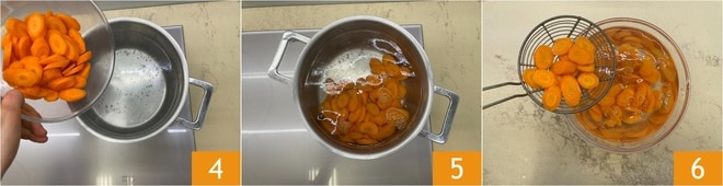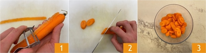 Um die gekochten Karotten zuzubereiten, stellen Sie zunächst einen Topf mit gesalzenem Wasser auf den Herd. Waschen Sie die Karotten, schälen Sie sie 1 und kürzen Sie sie. Schneiden Sie sie dann in etwa einen halben cm dicke Scheiben 2 und sammeln Sie sie nach und nach in einer Schüssel 3.