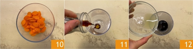 Geben Sie sie erneut in eine trockene Schüssel 10 und bereiten Sie inzwischen die Soße vor. Gießen Sie in einen hohen, schmalen Behälter die Sojasoße 11 und den Zitronensaft 12.