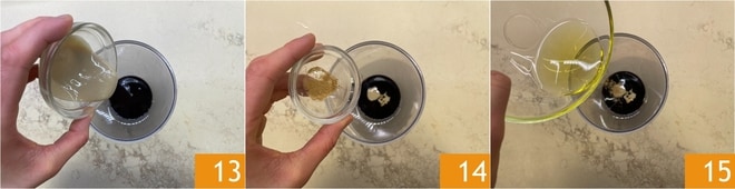 Fügen Sie die Tahina hinzu 13, das Ingwerpulver 14 und das Sesamöl 15.