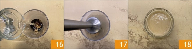 Fügen Sie zuletzt auch das Wasser hinzu 16 und mixen Sie alles mit einem Stabmixer 17, bis Sie eine glatte, cremige Soße erhalten 18.