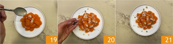 Richten Sie die Karotten an, indem Sie die Soße darüber geben 19; fügen Sie die Sesamsamen 20 und den in Scheiben geschnittenen grünen Teil der Frühlingszwiebel hinzu 21.