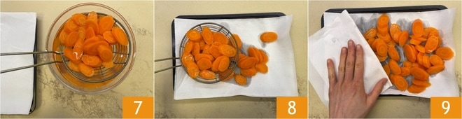 Gießen Sie sie erneut ab 7, legen Sie sie auf ein mit Küchenpapier ausgelegtes Tablett 8 und trocknen Sie sie gut mit einem weiteren Blatt Küchenpapier 9.