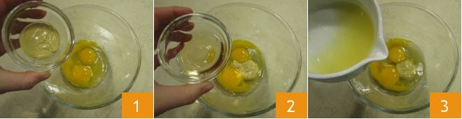 Um das Carpaccio alla Cipriani zuzubereiten, beginnen Sie mit der Herstellung der Mayonnaise: Geben Sie die zwei Eigelbe und das ganze Ei in eine Schüssel, fügen Sie den Senf 1, den weißen Weinessig 2 und den Zitronensaft 3 hinzu, dann salzen und pfeffern Sie.