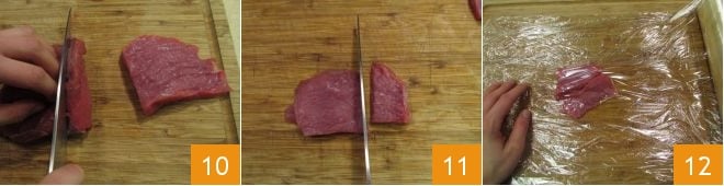 Nun kümmern Sie sich um das Carpaccio: Schneiden Sie das Entrecôte in Scheiben 10, halbieren Sie die Scheiben 11 und legen Sie sie zwischen zwei Frischhaltefolien 12.