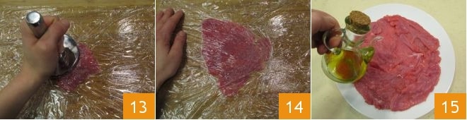 Schlagen Sie die Scheiben mit dem Fleischklopfer 13, bis sie dünn sind 14. Legen Sie das Carpaccio auf einen Teller, würzen Sie es mit dem Olivenöl 15
