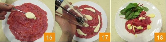 und verfeinern Sie es mit ein paar Teelöffeln der mit Worcestershire-Soße aromatisierten Mayonnaise 16. Zum Schluss salzen und pfeffern Sie 17. Das Carpaccio alla Cipriani ist fertig, servieren Sie es mit einem Beilagensalat 18.