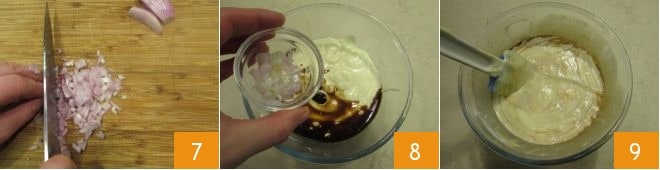 Schälen und hacken Sie die Schalotte fein 7, fügen Sie sie dann der Mayonnaise hinzu 8, würzen Sie sie mit Salz und Pfeffer und mischen Sie mit einem Spatel, um die Soße zu vermengen 9.