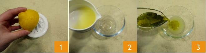 Um das Rindercarpaccio mit Rucola und Grana zuzubereiten, beginnen Sie mit der Zitronensoße; pressen Sie die Zitronen 1 aus und geben Sie den gefilterten Saft in eine Schüssel 2: Fügen Sie das Öl hinzu 3,