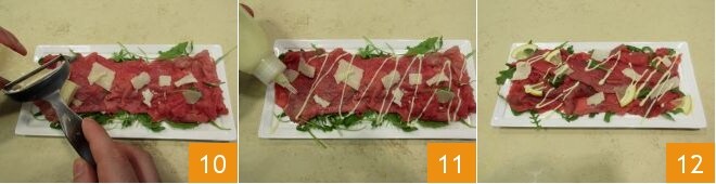 Fügen Sie auch die Käsespäne hinzu 10, dann beenden Sie mit der Zitronensoße 11 und einigen Zitronenscheiben, schließlich können Sie Ihr Rindercarpaccio mit Rucola und Grana servieren und genießen 12.