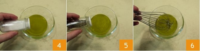 das Salz und den gemahlenen Pfeffer (4-5), dann emulgieren Sie die Soße mit Hilfe eines Schneebesens 6.
