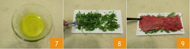 Sobald sie fertig ist 7, geben Sie die Soße in einen Spender. Legen Sie die Rucola gleichmäßig verteilt auf eine Servierplatte 8, schneiden Sie das Fleisch mit Hilfe einer Aufschnittmaschine in sehr dünne Scheiben und verteilen Sie es auf der Rucola 9.