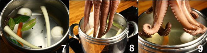 Füllen Sie einen großen Topf zu ¾ mit Wasser, fügen Sie die geschälte Karotte, die halbierte geschälte Zwiebel, die Selleriestangen, die Lorbeerblätter, die Wacholderbeeren, die Pfefferkörner und das Salz hinzu 7. Bringen Sie alles zum Kochen, tauchen Sie dann die Spitzen der Oktopus-Tentakeln 4-5 Mal in die kochende Flüssigkeit ein und ziehen Sie sie heraus, damit sie sich kringeln (8-9) (sie werden ansprechender aussehen):