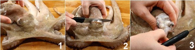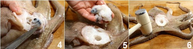 und entfernen Sie die Augen und den Schnabel (Zahn) (4-5); entleeren Sie auch das Innere der Tasche, und wenn Sie es mit einem größeren Oktopus zu tun haben, machen Sie das Fleisch zarter, indem Sie es leicht mit einem Fleischklopfer schlagen 6.