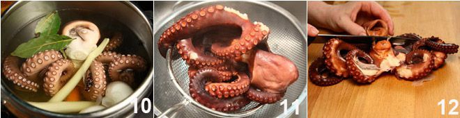 tauchen Sie dann den Oktopus vollständig in die kochende Flüssigkeit 10 und lassen Sie ihn etwa 70 Minuten kochen. Der Oktopus sollte gar, aber noch fest sein, überprüfen Sie daher den Garzustand, indem Sie eine Gabel in das Fleisch stechen. Wenn der Oktopus gar ist, nehmen Sie ihn aus der Kochflüssigkeit, lassen Sie ihn abtropfen 11, schneiden Sie ihn in 4-5 Stücke (12-13).