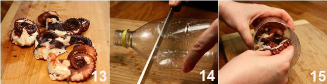 Bereiten Sie dann die Plastikflasche 14 vor, mit der Sie dem Oktopus-Fleisch eine zylindrische Form geben: Schneiden Sie die Oberseite ab und geben Sie den Oktopus harmonisch hinein 15, da sie einmal gepresst ein Muster auf der Scheibe bilden werden, die Sie schneiden.