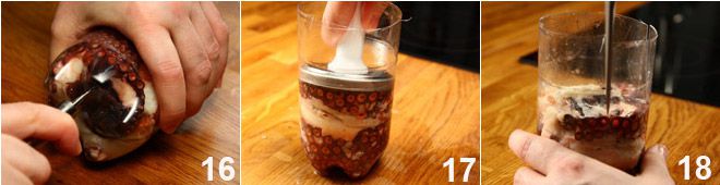 durchstechen Sie dann den Boden mit einer spitzen Schere 16, eine Aktion, die dazu dient, überschüssige Flüssigkeit freizusetzen, während Sie den Oktopus pressen, und führen Sie ihn in die Flasche ein, die Sie auf einen Teller gelegt haben; helfen Sie sich mit einer gut gereinigten Glasflasche (oder etwas anderem, das Ihnen beim Drücken hilft, wie einem Stößel oder einem Fleischklopfer) von etwas kleinerem Durchmesser als die Plastikflasche, und pressen Sie das Oktopus-Fleisch nach unten 17; wie Sie bemerken werden, tritt durch die Löcher im Boden der Flasche viel Kochflüssigkeit aus. Schneiden Sie mit der Schere die Enden der Flasche, um Laschen zu formen 18