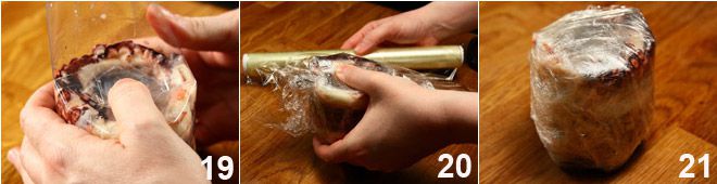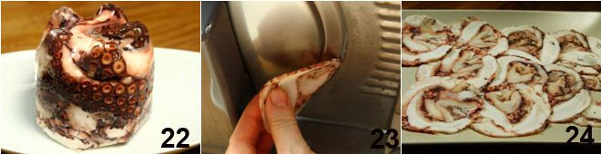 So gepresst, legen Sie den Oktopus für mindestens 24 Stunden in den kältesten Teil des Kühlschranks, danach, wenn es serviert wird, schneiden Sie die Plastikflasche 22, extrahieren Sie den Oktopus in einem einzigen zylindrischen Block und schneiden ihn fein mit einem Messer oder, noch besser, mit einer Schneidemaschine (23-24), als wäre es eine Salami.