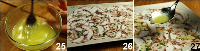 Bereiten Sie dann die Zitronensauce vor, die dem Oktopus Geschmack verleiht, indem Sie Zitronensaft, Olivenöl und eine Prise Salz 25 mischen. Legen Sie die Oktopus-Scheiben auf einen Servierteller, bestreuen Sie sie mit gehackter Petersilie 26, Knoblauch und würzen Sie mit der Zitronensauce 27. Garnieren Sie das Oktopus-Carpaccio mit Zitronenscheiben (oder -spalten) und Petersilienzweigen.