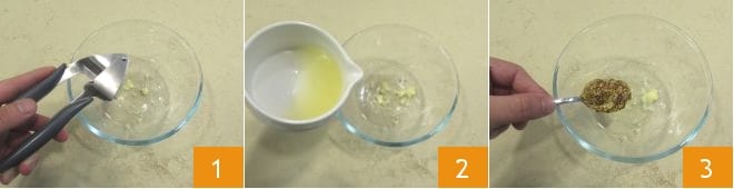 Um das geräucherte Schwertfisch-Carpaccio mit Apfel-Rucola-Salat zuzubereiten, beginnen Sie mit dem Dressing. Pressen Sie die Knoblauchzehe mit einer Knoblauchpresse 1 und geben Sie sie in eine kleine Schüssel. Fügen Sie den gefilterten Zitronensaft 2 und den groben Senf 3 hinzu.