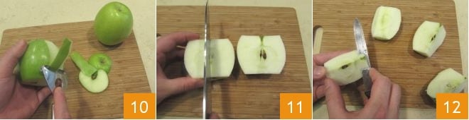 Und schälen Sie die Äpfel mit einem Sparschäler 10. Schneiden Sie dann jeden Apfel in zwei Hälften und jede Hälfte in 2 Teile 11, um aus jedem Apfel 4 Spalten zu erhalten. Entfernen Sie den Kern von jeder Spalte 12.