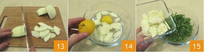 Schneiden Sie die Spalten jetzt in sehr dünne Scheiben 13 und legen Sie sie in eine Schüssel mit kaltem Wasser und der Schale der ausgepressten Zitrone 14, um die Oxidation der Frucht bei Kontakt mit der Luft zu verhindern. Bereiten Sie in einer großen Schüssel den Rucola vor. Lassen Sie die Äpfel abtropfen und fügen Sie sie in die Schüssel 15