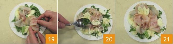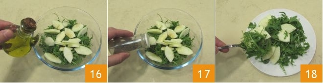 Würzen Sie mit dem Öl 16, Salz und Pfeffer 17, mischen Sie ein wenig und geben Sie den so gewürzten Salat auf den Servierteller 18