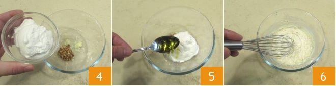 Fügen Sie auch den griechischen Joghurt 4 hinzu, würzen Sie mit dem Olivenöl extra vergine 5 und mischen Sie gut mit einem Schneebesen, bis die Sauce glatt und homogen ist 6.