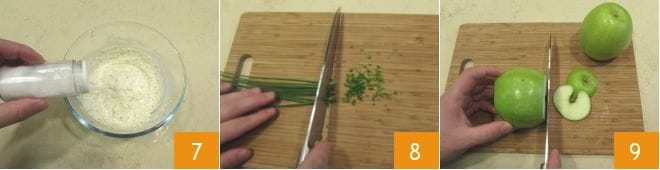Stellen Sie die Sauce mit Pfeffer und Salz ein 7 und lassen Sie sie beiseite. Schneiden Sie den Schnittlauch fein 8 und legen Sie ihn ebenfalls beiseite. Wenden Sie sich dann den Äpfeln zu: Schneiden Sie die oberen und unteren Enden mit dem Stiel ab 9