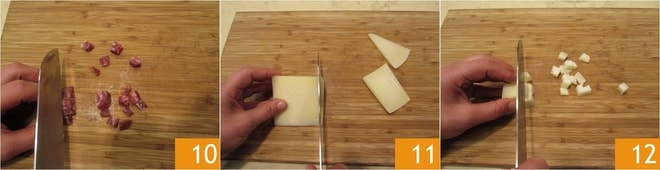 Entfernen Sie die Haut von der Salami und schneiden Sie sie in Würfel 10. Entfernen Sie mit einem Messer die Rinde vom Pecorino 11 und schneiden Sie ihn in Würfel von der gleichen Größe wie die Salami 12.