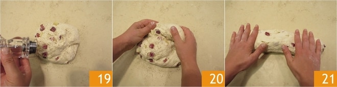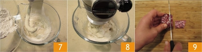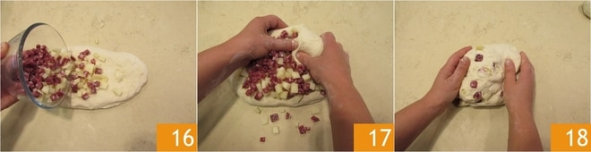 Geben Sie die Pecorino- und Salamiwürfel in die Mitte 16 und arbeiten Sie den Teig mit den Händen, bis alle Zutaten gleichmäßig eingearbeitet sind 17 18.
