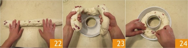 Wenn er lang genug ist 22, legen Sie den Laib in eine Kranzform mit einem Durchmesser von 24 cm, die Sie zuvor eingefettet haben 23, und verbinden und versiegeln Sie die beiden Enden 24.