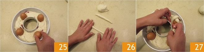 Jetzt positionieren Sie die rohen Eier senkrecht an vier gut verteilten Stellen des Casatiello und üben Sie leichten Druck aus 25. Nehmen Sie den beiseite gelegten Teig und formen Sie daraus 8 Stränge 26. Legen Sie die Stränge über die Eier, um sie zu umschließen und ein Kreuz zu bilden 27.
