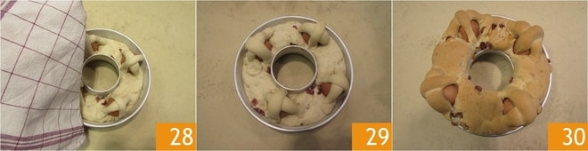 Wenn Sie fertig sind, decken Sie den Casatiello mit einem sauberen Küchentuch ab 28 und lassen Sie ihn bei Raumtemperatur, fern von Zugluft, etwa 1 bis 1,5 Stunden gehen. Sobald das Volumen fast verdoppelt ist 29, backen Sie Ihren neapolitanischen Casatiello im vorgeheizten statischen Ofen bei 170° für 75 Minuten, indem Sie die Form auf den Boden des Ofens stellen. Nach dem Backen lassen Sie ihn abkühlen, bevor Sie ihn vorsichtig aus der Form nehmen und auf einem Servierteller platzieren. Ihr zerrissener Casatiello ist bereit, mit der ganzen Familie geteilt zu werden 30!