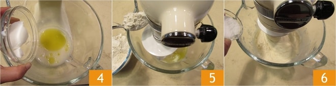 Fügen Sie auch die anderen Fette hinzu: Öl und Schmalz 4. Beginnen Sie, die Zutaten bei niedriger Geschwindigkeit zu vermischen, und fügen Sie nach und nach die Hälfte der Mehlmenge hinzu, wobei Sie einen Löffel verwenden 5. Sobald das Mehl aufgenommen ist und Sie eine Art Teig erhalten haben, fügen Sie das Salz hinzu 6.