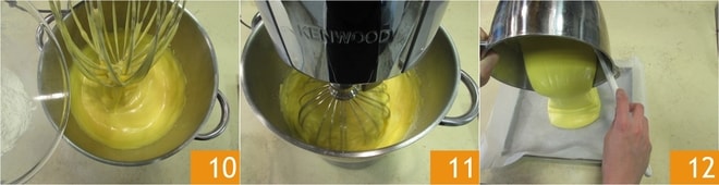 Haben Sie keine Eile und fügen Sie das Mehl erst hinzu, wenn die Eier gut aufgeschlagen sind 10, und rühren Sie kurz mit dem Schneebesen 11. Beenden Sie das Rühren mit einem Teigschaber, dann die Masse in eine mit Backpapier ausgelegte 30x40 cm Form füllen 12.