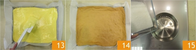 Die Oberfläche mit einem Spatel glattstreichen 13 und im vorgeheizten Umluftofen bei 160°C für 30 Minuten auf der mittleren bis unteren Schiene backen. Dann aus dem Ofen nehmen 14 und abkühlen lassen. In der Zwischenzeit die Tränke vorbereiten. Wasser und Zucker in einen Topf geben 15 und zum Kochen bringen.