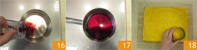 Wenn der Zucker vollständig aufgelöst ist, den Alkermes hinzufügen 16 und mischen. Dann abkühlen lassen 17. Sobald der Biskuitboden kalt ist, auf ein Schneidebrett stürzen und mit einem großen Ausstecher von 7-8 cm Durchmesser Kreise ausstechen 18.